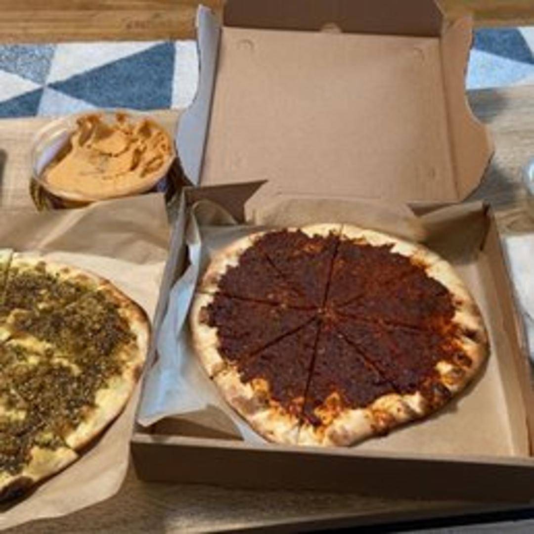 A warm, flatbread topped with a vibrant and flavorful Mouhammara spread. This spread is typically made with roasted red peppers, walnuts, breadcrumbs, olive oil, and spices, offering a delightful balance of sweet, smoky, and slightly tangy flavors.