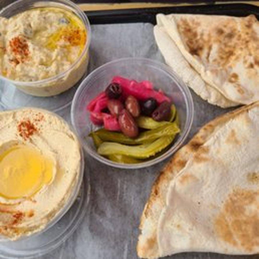 Smoked eggplant dip blended with tahini, garlic, lemon juice, and olive oil. Served with pita bread.