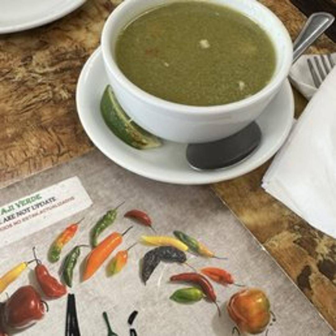 Large bowl of Peruvian chicken and rice soup with cilantro, vegetables, and a light broth.