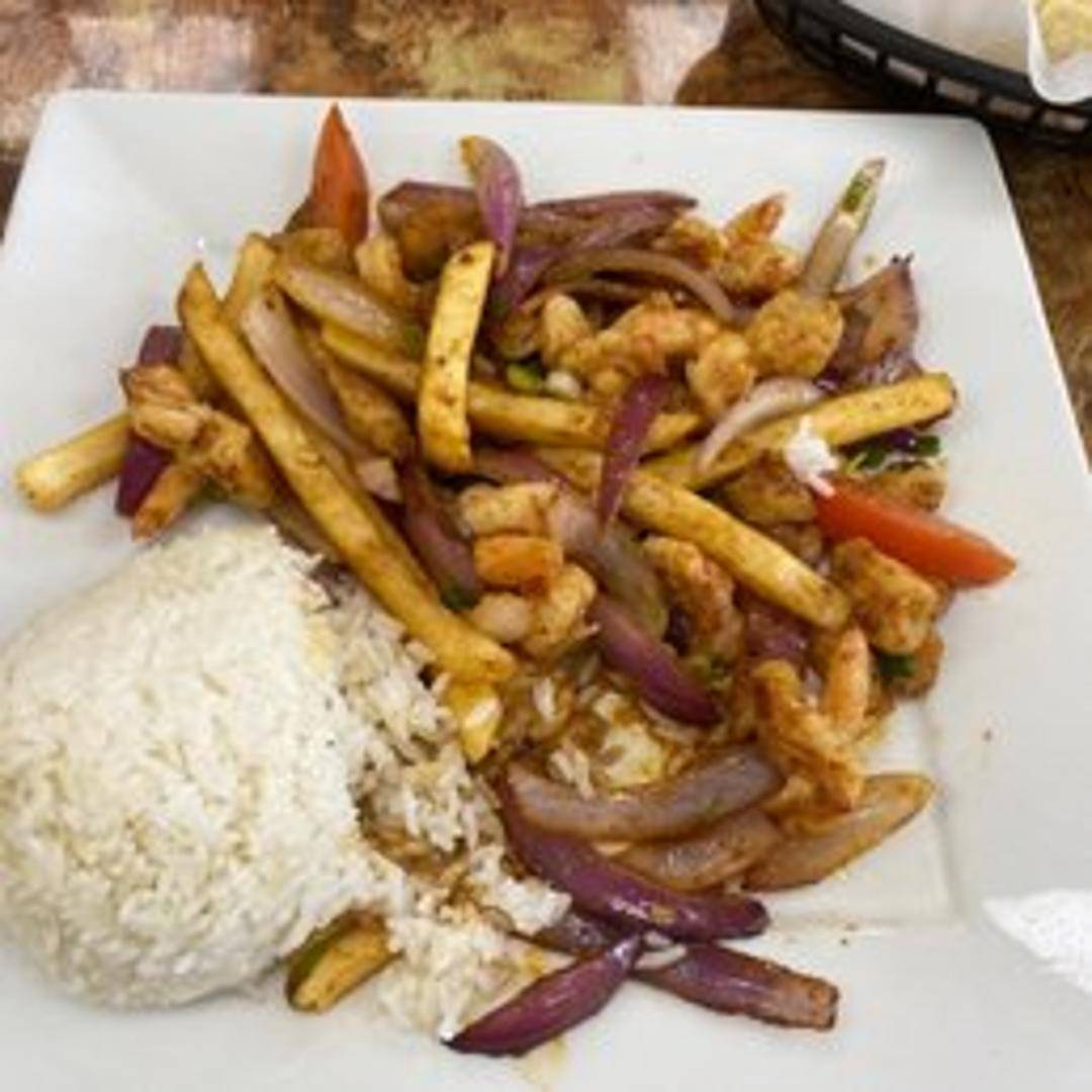 Stir-fried seafood (shrimp, calamari, mussels) with onions, tomatoes, and peppers, served with rice and french fries.