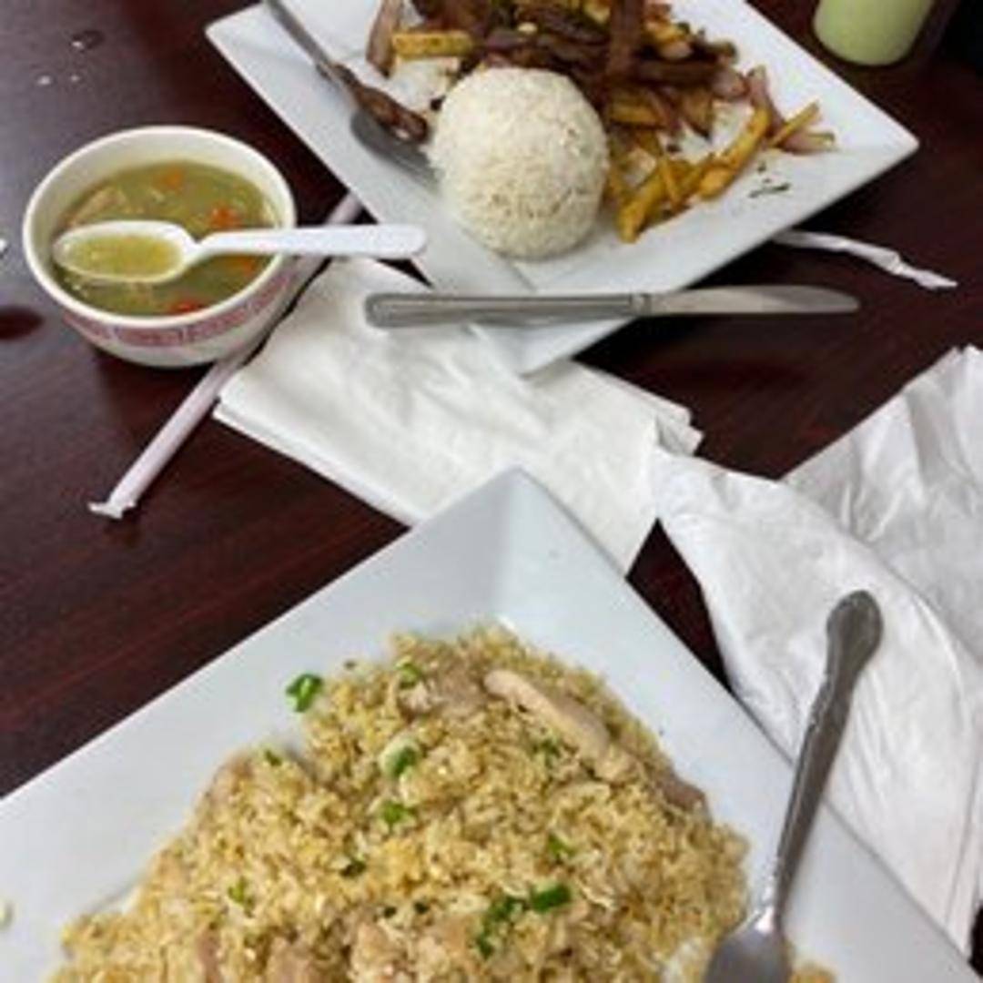 Peruvian-Chinese fried rice dish with chicken, eggs, green onions, and soy sauce.