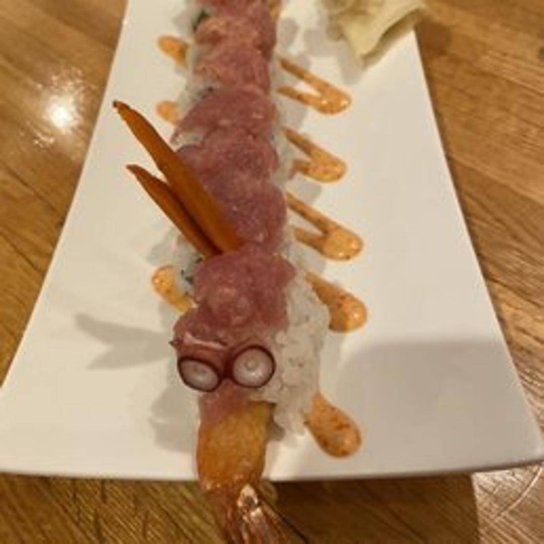 Experience the vibrant flavors of our signature Red Dragon Roll. This exquisite sushi creation typically features crispy shrimp tempura and fresh cucumber inside, elegantly crowned with slices of luscious tuna and creamy avocado. It is often drizzled with a delicate special sauce, offering a harmonious blend of textures and tastes that is both visually striking and incredibly satisfying.