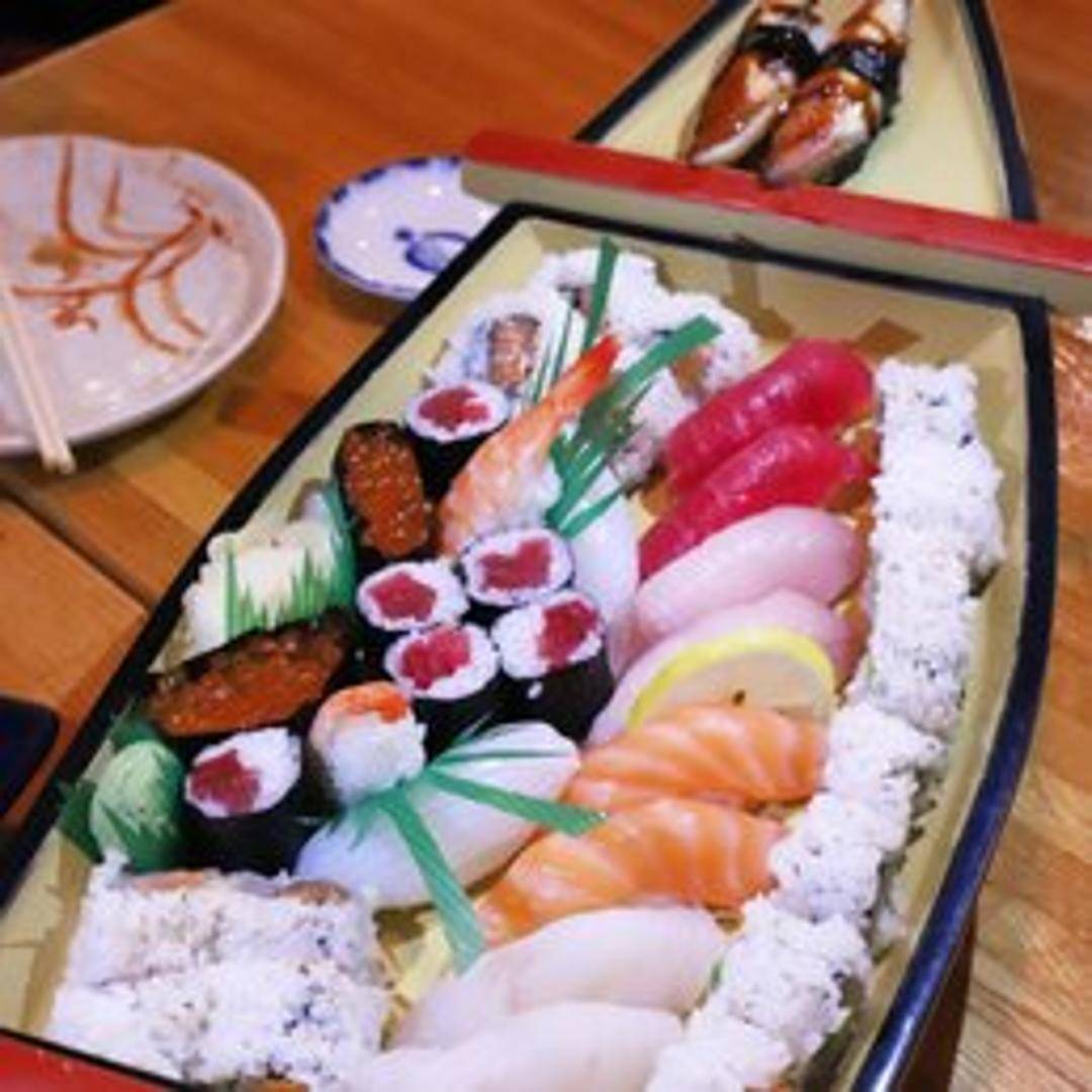 An impressive and generous presentation of chef-selected sushi and sashimi, served artfully arranged on a large, traditional wooden boat platter. Ideal for sharing, this grand assortment typically includes a variety of nigiri (sliced fish over rice), sashimi (sliced raw fish), and assorted maki (rolls), offering a comprehensive culinary journey through Akai Hana's finest offerings.