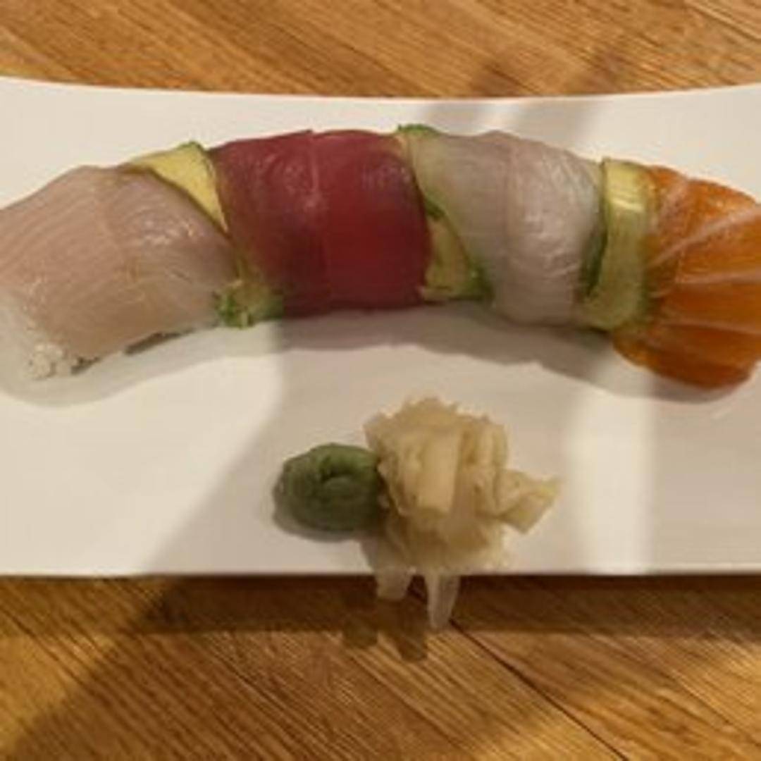 A vibrant and visually appealing sushi roll that typically starts with a California Roll base, then topped with an array of thinly sliced fresh fish such as tuna, salmon, yellowtail, and sometimes shrimp, along with avocado, creating a colorful 'rainbow' effect.