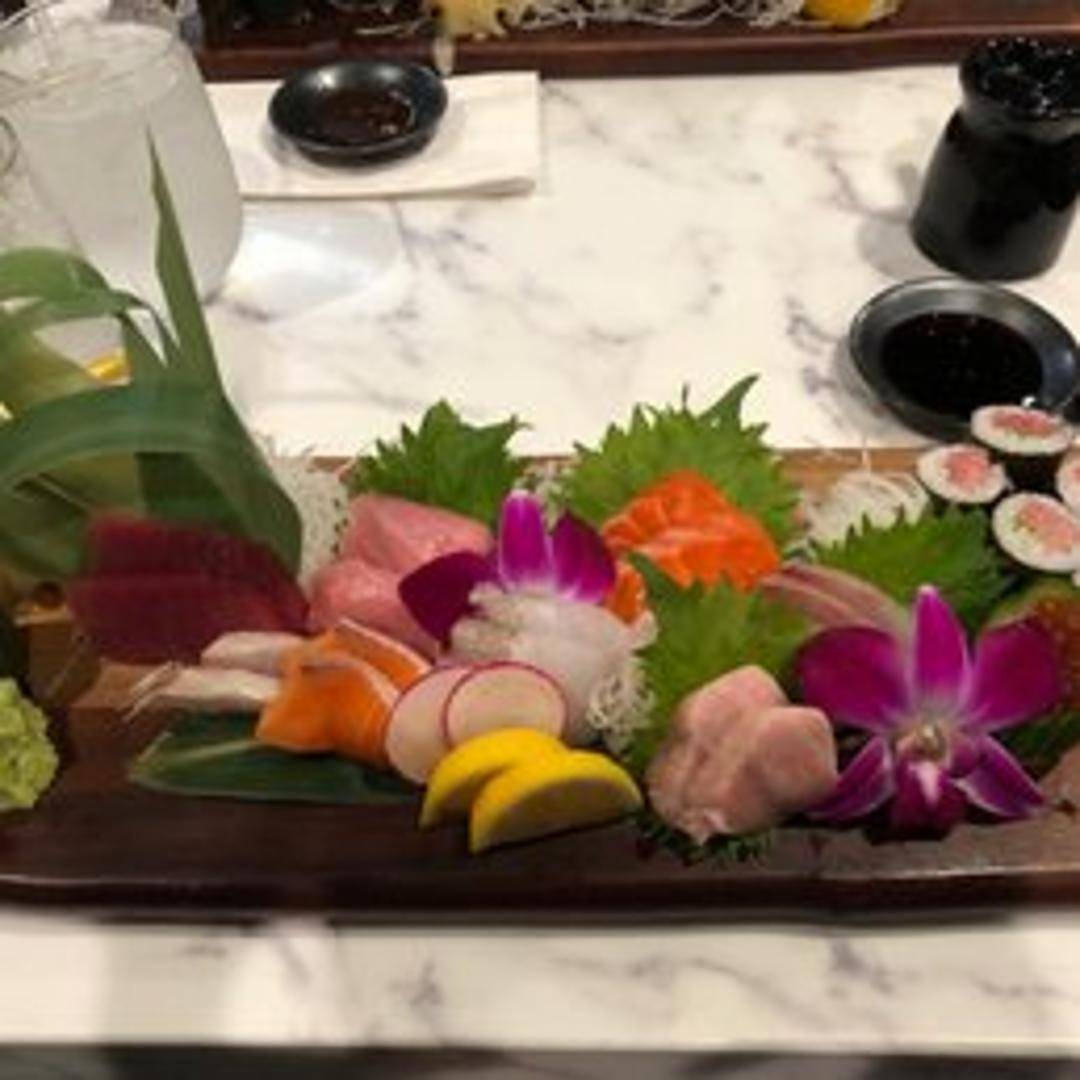 A chef's selection of assorted, thinly sliced raw fish. Includes a variety of seasonal fish, such as tuna, salmon, yellowtail, and white fish, served with soy sauce, wasabi, and pickled ginger.