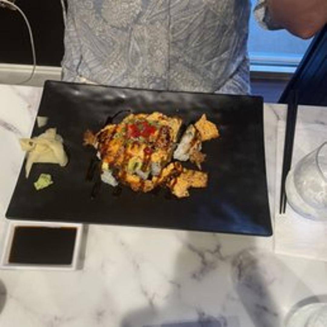 A visually stunning and flavorful sushi roll featuring shrimp tempura, cucumber, and avocado inside, topped with a layer of eel, avocado, and a drizzle of eel sauce. Garnished with sesame seeds and masago.