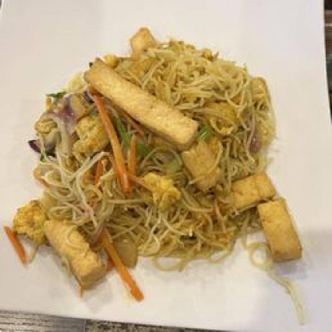 Thin rice noodles stir-fried with shrimp, chicken, vegetables, and curry powder, creating a flavorful and slightly spicy dish.