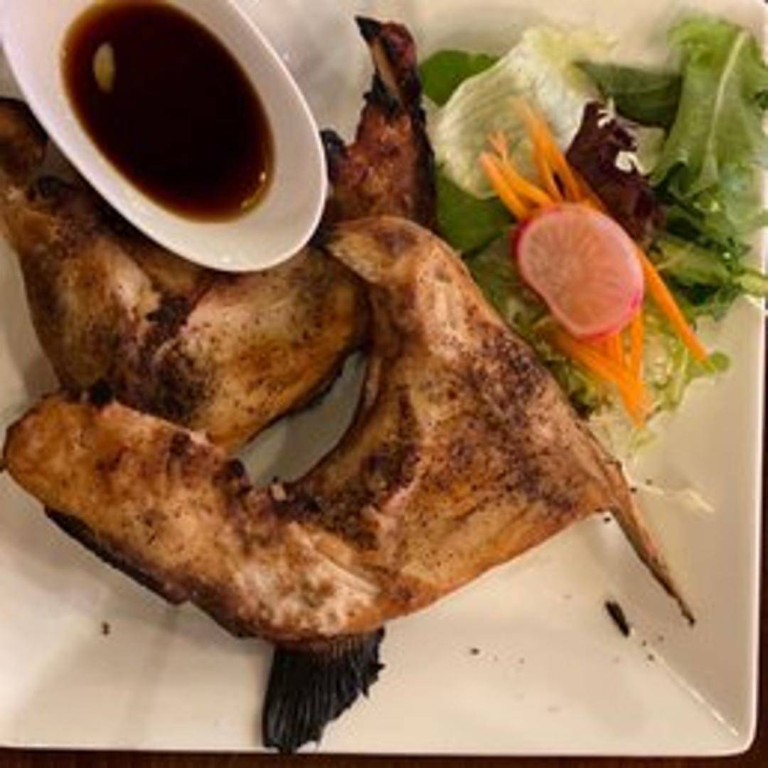 A delicacy of grilled yellowtail collar, expertly prepared to achieve a crispy exterior and tender, rich, fatty meat. Known for its succulent flavor profile, it's often lightly seasoned and served with a side of ponzu sauce or lemon for a bright, citrusy complement.
