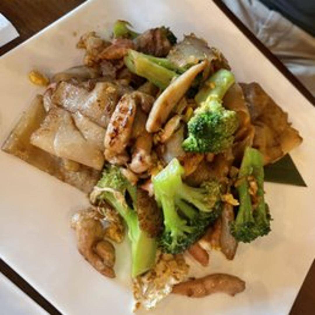 A beloved Thai stir-fried noodle dish featuring wide, flat rice noodles wok-tossed with tender pieces of chicken, crisp Chinese broccoli, and scrambled egg. The dish is seasoned with a rich, savory-sweet dark soy sauce, creating a harmonious balance of flavors and textures, making it a comforting and satisfying classic.