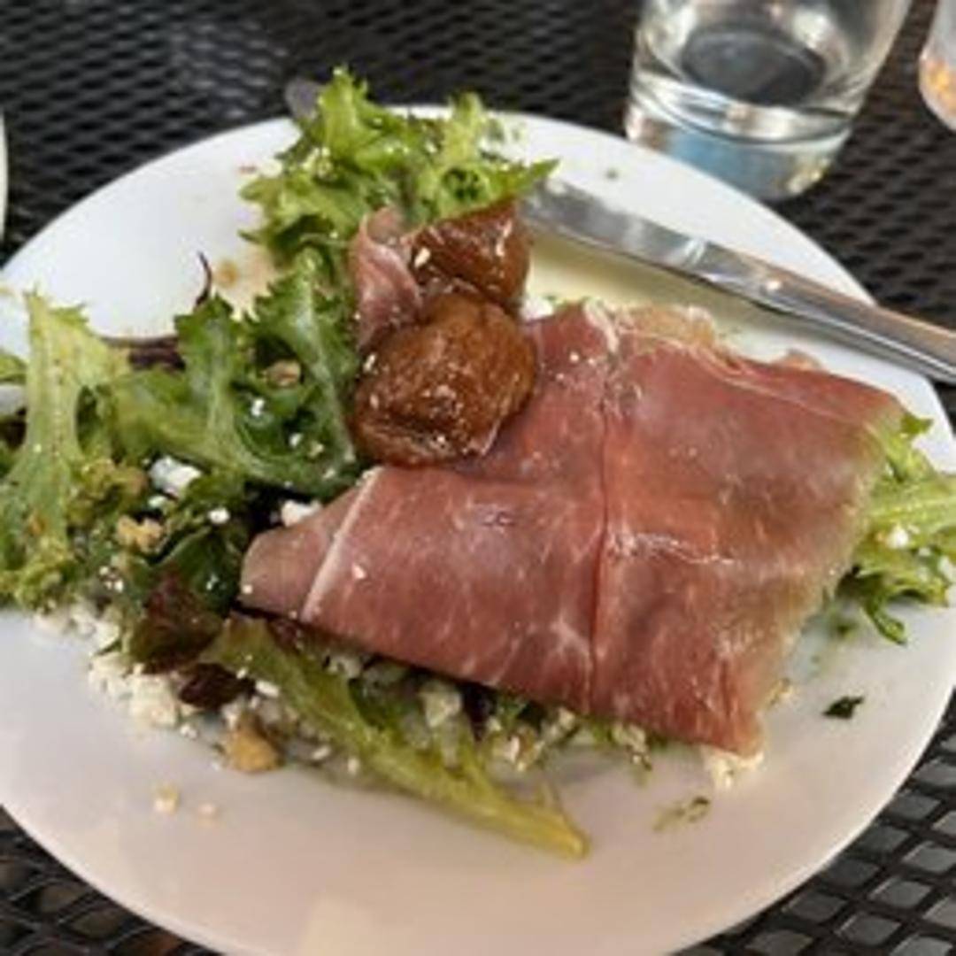 A vibrant salad featuring grilled figs, mixed greens, crumbled goat cheese, candied walnuts, and a balsamic vinaigrette.