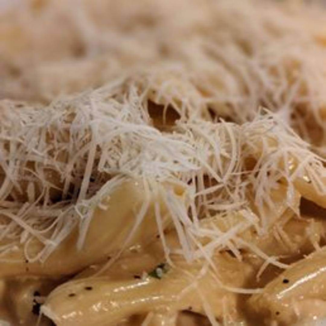 Pasta tossed in a creamy sauce made with pancetta, eggs, Parmesan cheese, and black pepper.