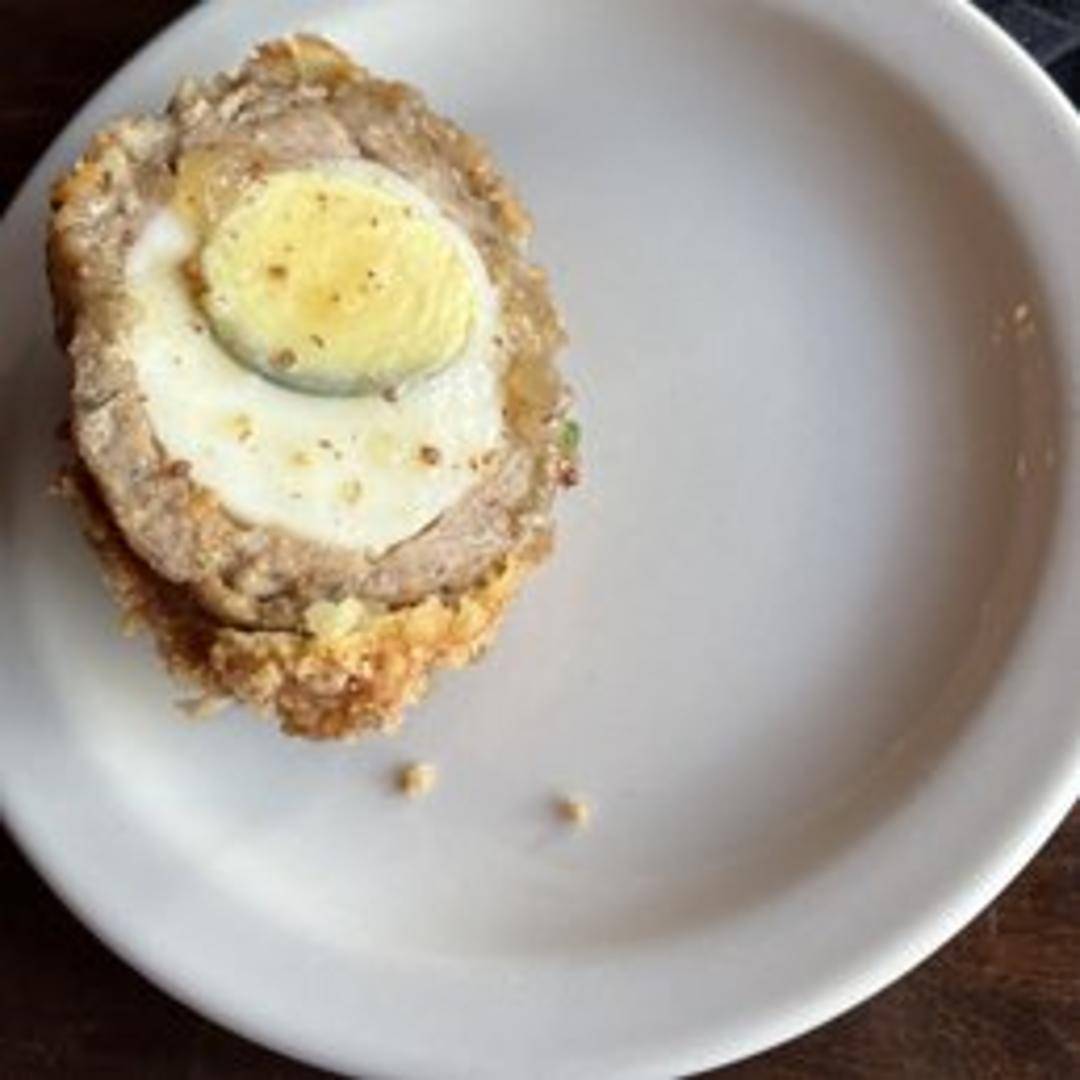 Hard-boiled eggs wrapped in seasoned sausage meat, coated in breadcrumbs, and deep-fried to a golden brown. Served warm with a side of Dijon mustard or brown sauce.