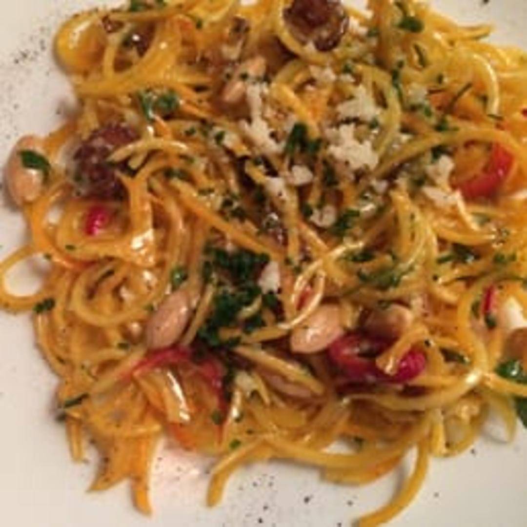 A vibrant and seasonal salad featuring raw sugar pumpkins, likely prepared in thin slices or small cubes. Expect a combination of sweet, savory, and earthy flavors. The salad probably incorporates a variety of complementary ingredients such as toasted nuts (pecans or walnuts are likely), dried cranberries or other dried fruits, greens (arugula or kale are common choices), and a vinaigrette dressing with a touch of acidity to balance the sweetness of the pumpkin. Herbs like sage or thyme might also be present to enhance the earthy notes.