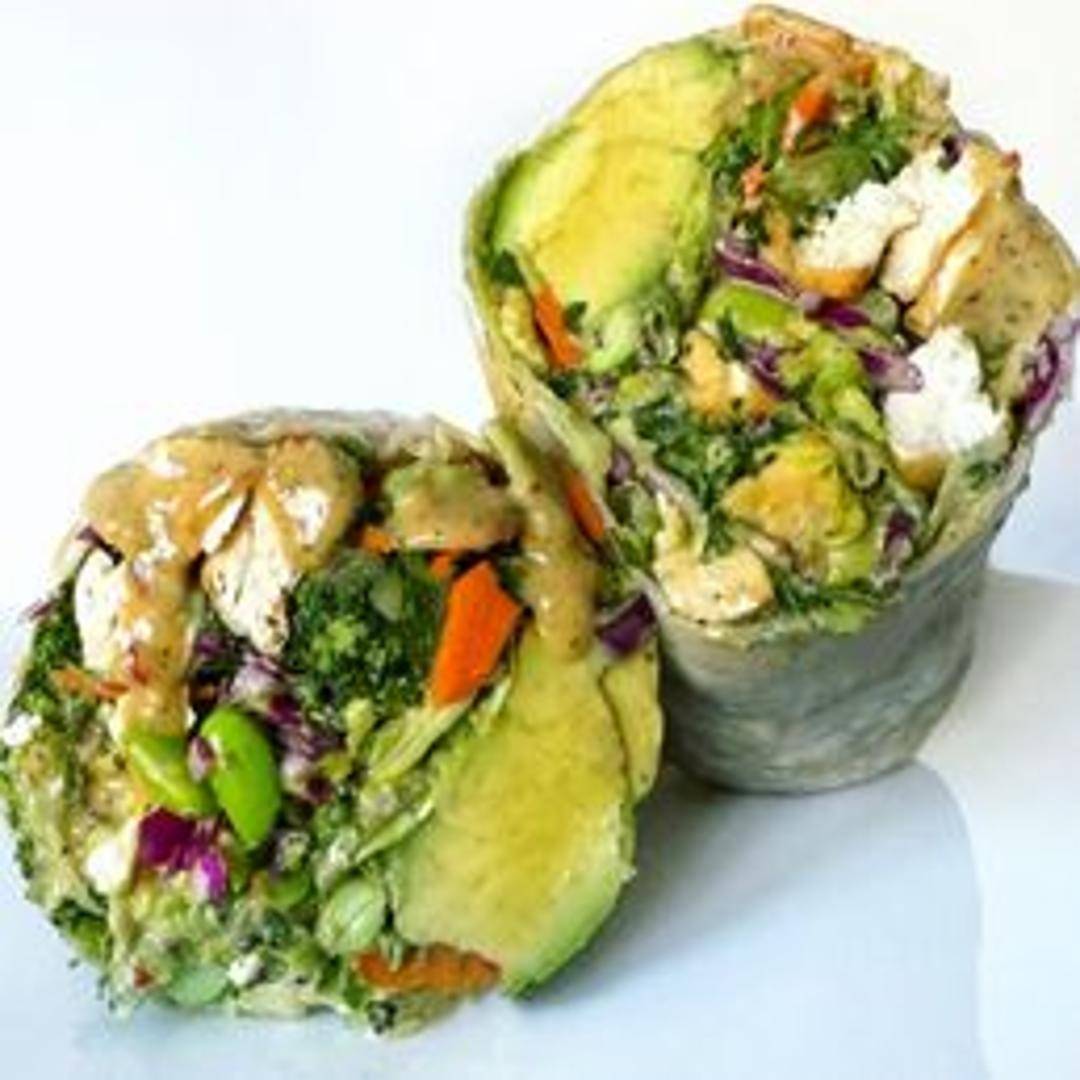 A flavorful wrap with Beyond Meat crumbles, shredded carrots, cucumbers, pickled daikon, cilantro, mint, and a spicy peanut sauce, all wrapped in a soft tortilla.
