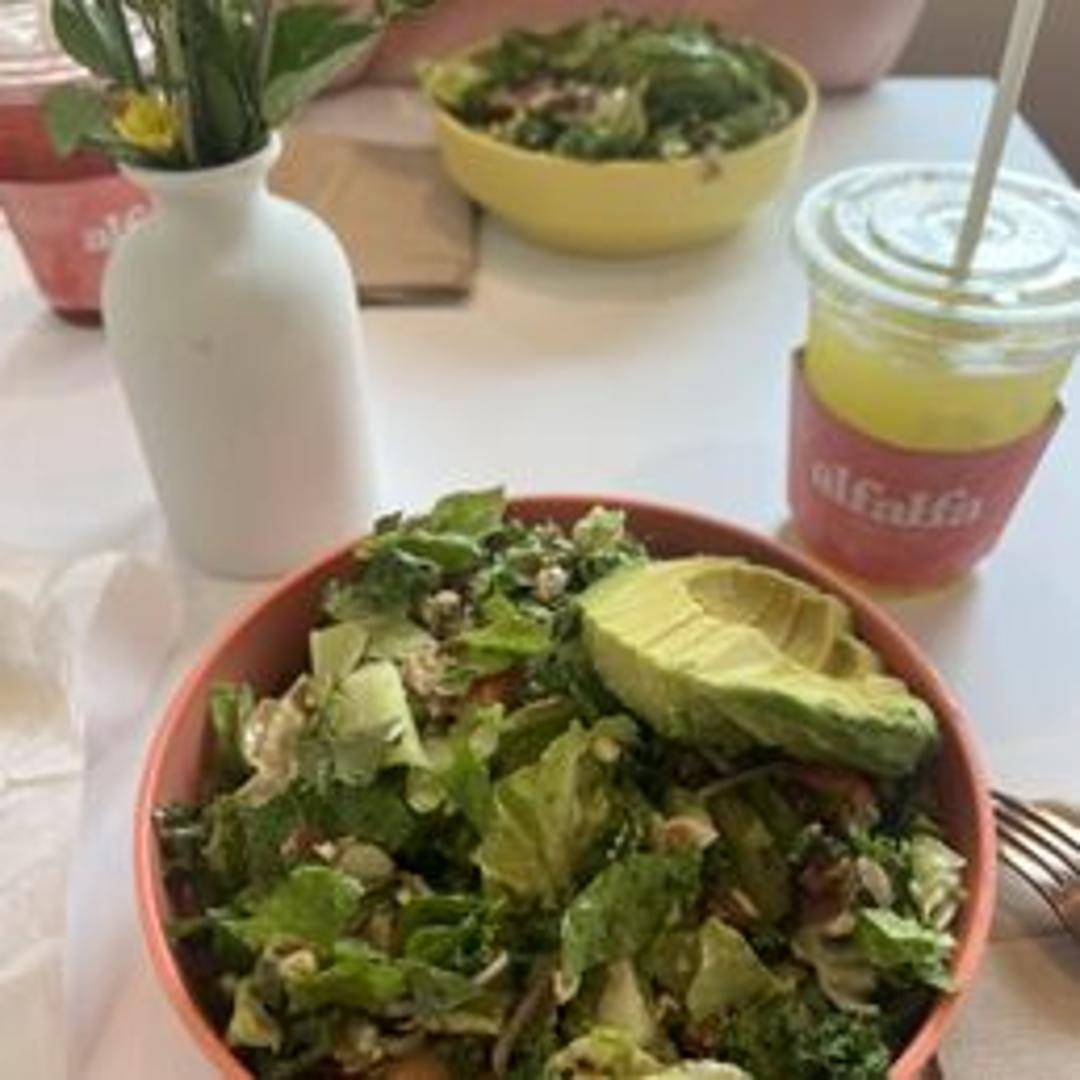 A refreshing salad featuring mixed greens, grilled chicken, avocado, roasted corn, black beans, tomatoes, red onion, cilantro, and a creamy cilantro-lime dressing. Served with crispy tortilla strips.