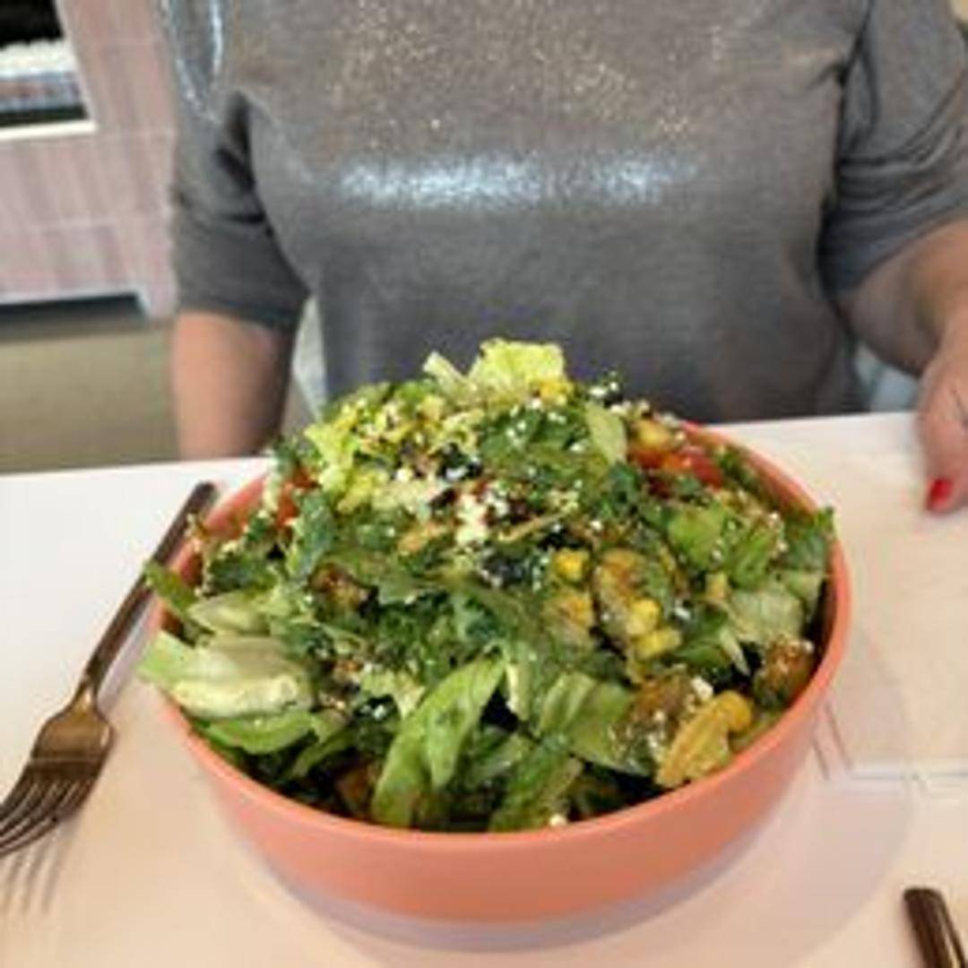 A vibrant salad featuring shredded Peruvian-spiced chicken, mixed greens, quinoa, roasted sweet potatoes, avocado, pickled onions, and aji amarillo dressing.