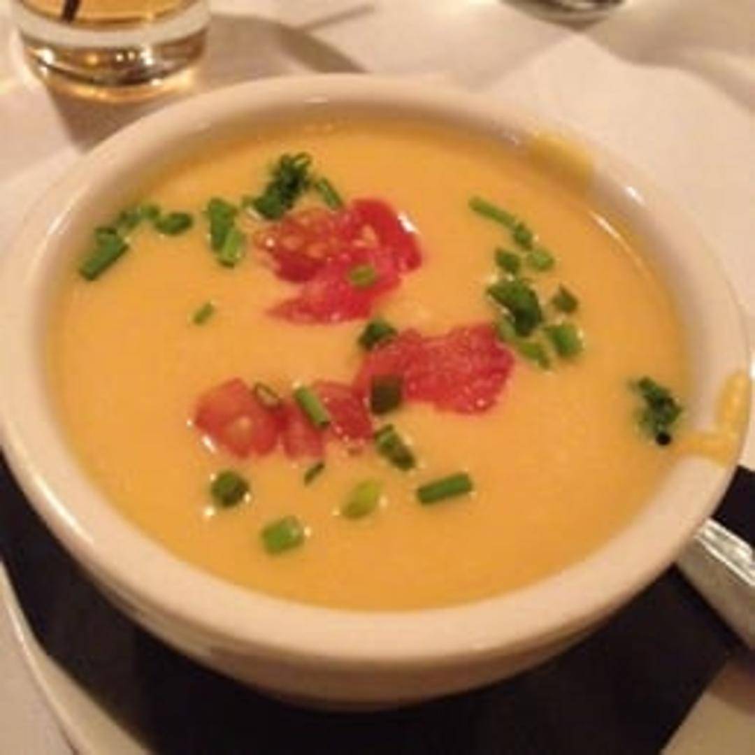 A velvety smooth and comforting soup, crafted from roasted butternut squash, subtly spiced with warm autumnal flavors and finished with a delicate touch of cream, offering a harmonious blend of sweetness and savory depth.