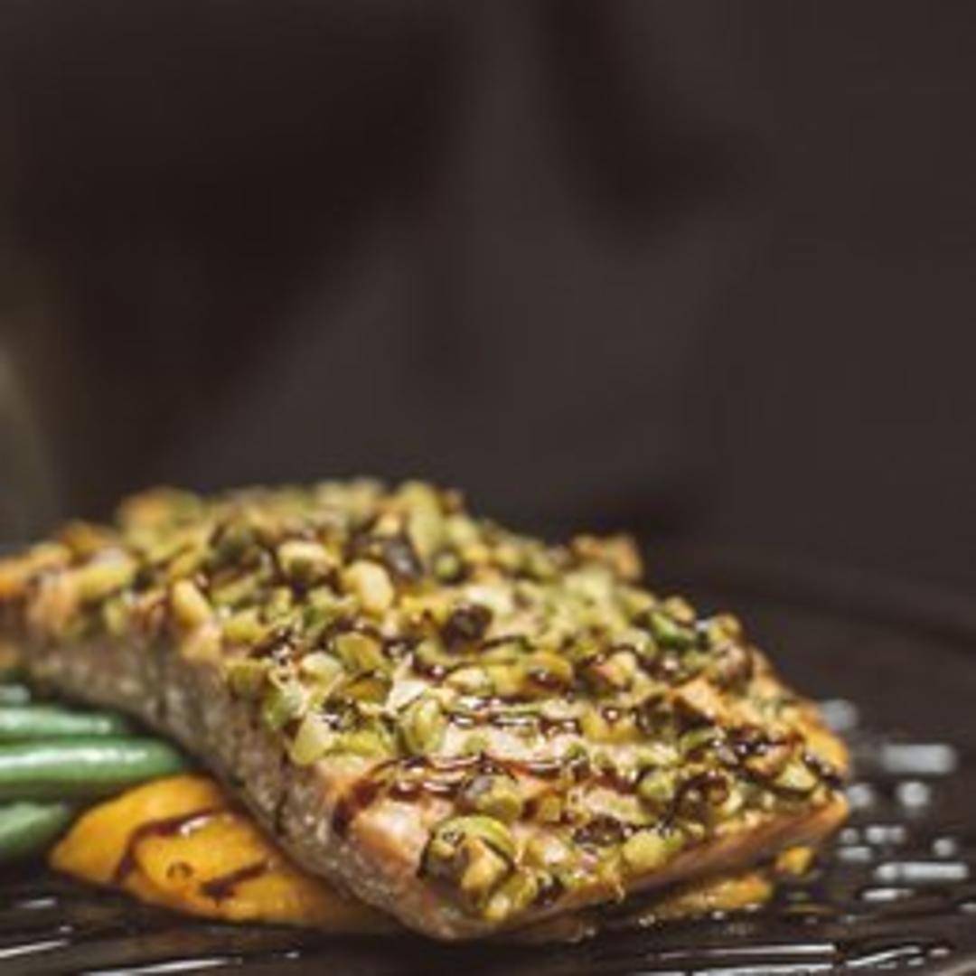 A culinary masterpiece featuring a perfectly pan-seared or baked Atlantic salmon fillet, generously coated with a crunchy and aromatic pistachio crust. This exquisite dish is served atop a bed of creamy polenta or quinoa, drizzled with a light lemon-dill sauce or a delicate beurre blanc, and garnished with fresh asparagus.