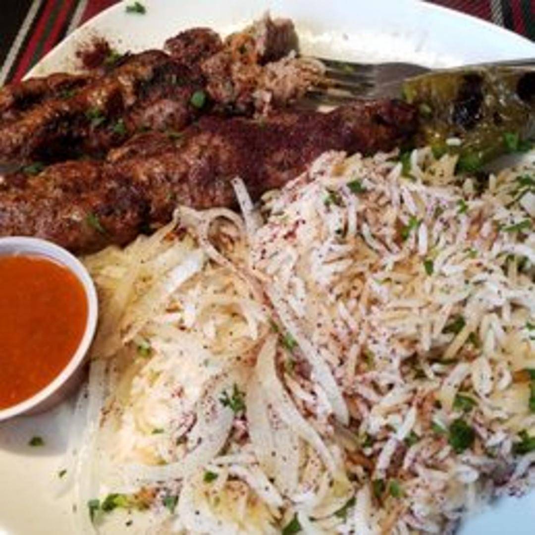 Ground beef and lamb mixed with onions, parsley, and spices, formed into a kabob and grilled. Served on a plate with rice, grilled vegetables, and hummus.