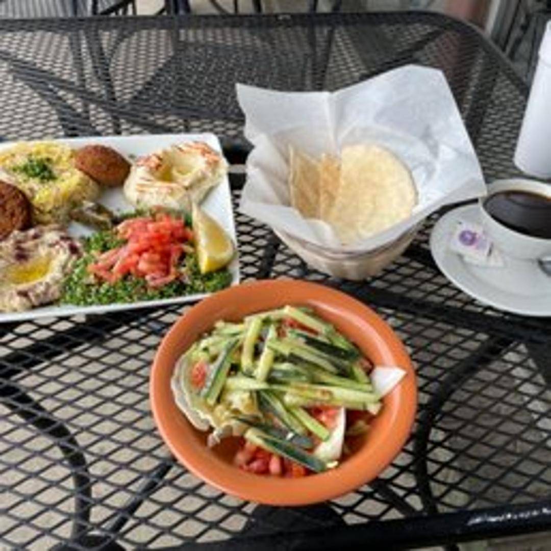 A generous plate featuring a variety of vegetarian delights, such as falafel, hummus, baba ghanoush, tabouli, and stuffed grape leaves. Served with pita bread.