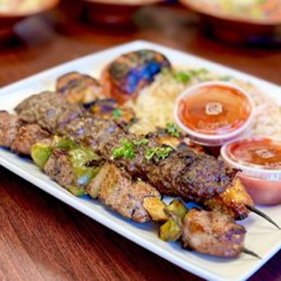 A combination plate with gyro meat, beef shawarma, and kafta kabob. Served with rice and hummus.