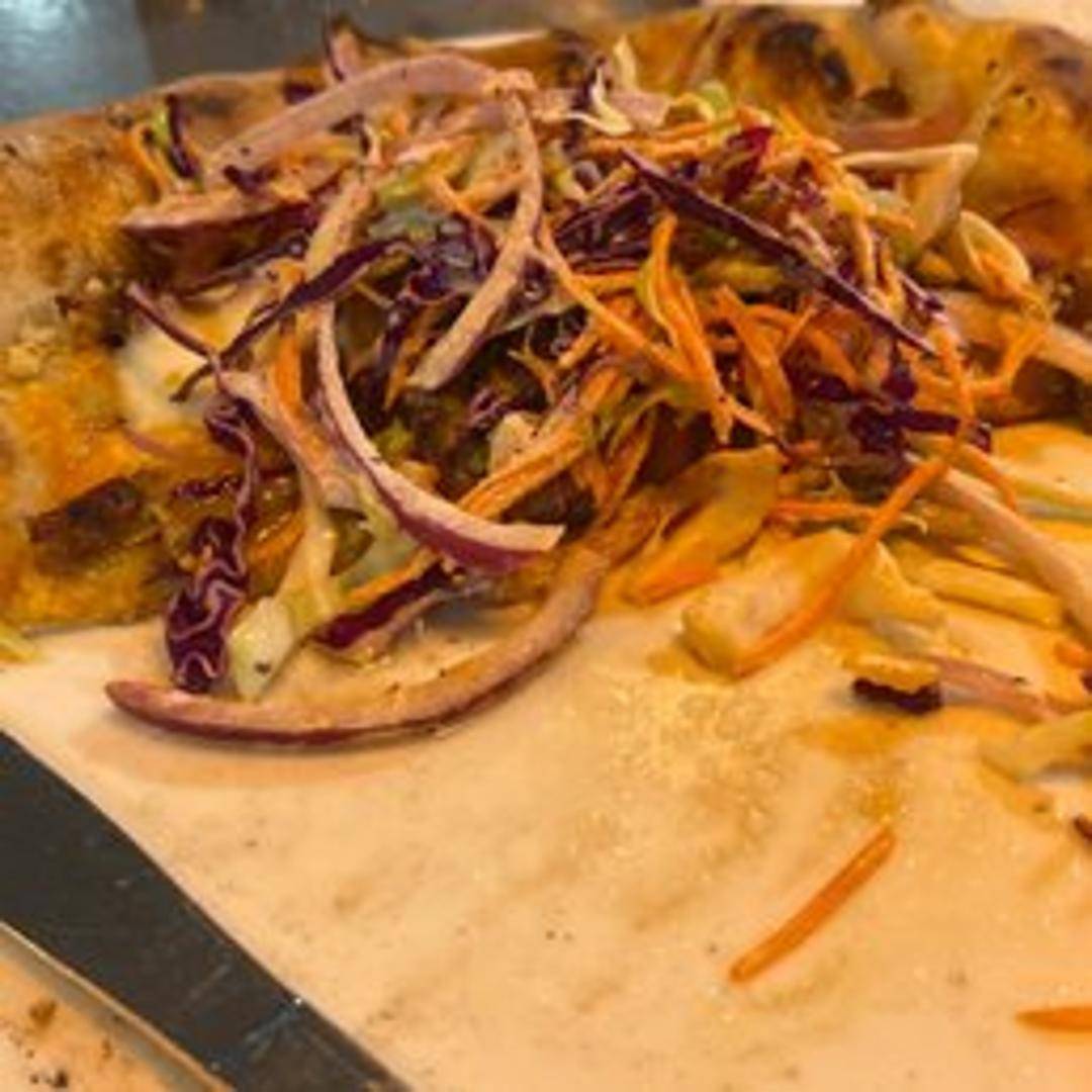 Wood-fired pizza topped with slow-cooked pulled pork, tangy BBQ sauce, red onions, smoked gouda cheese, and a sprinkle of cilantro.