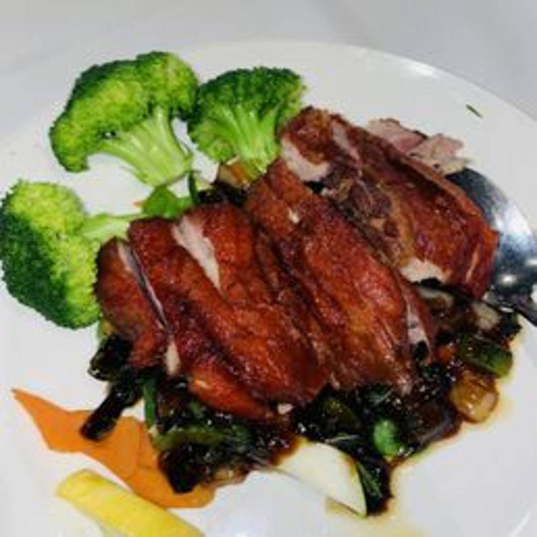 Roasted duck with a beautifully crisp skin and succulent meat. Prepared using traditional methods, the duck is expertly seasoned and slow-cooked to achieve optimal tenderness and flavor. A culinary delight.