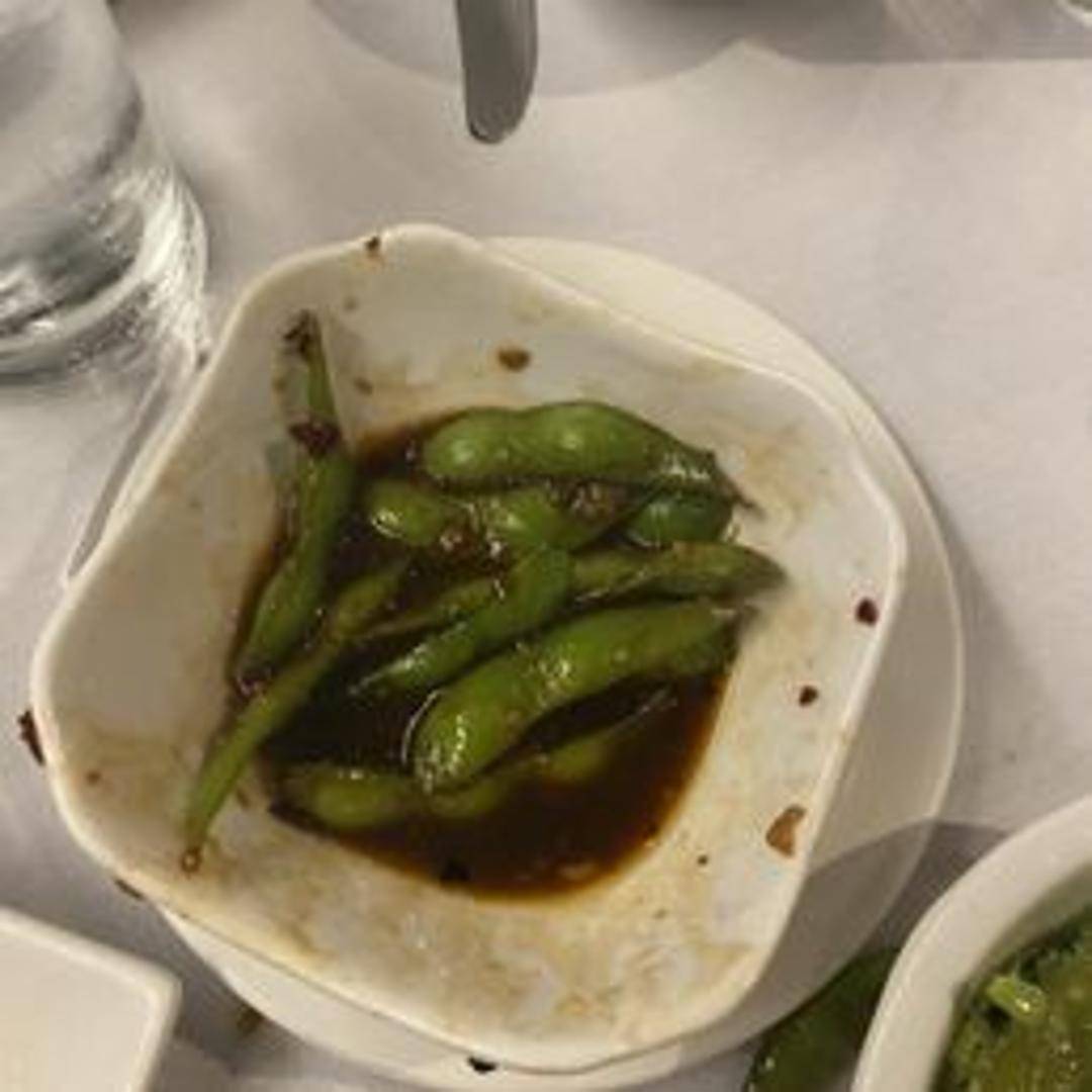Steamed edamame pods tossed in a spicy seasoning blend, often featuring chili flakes, garlic, and soy sauce.