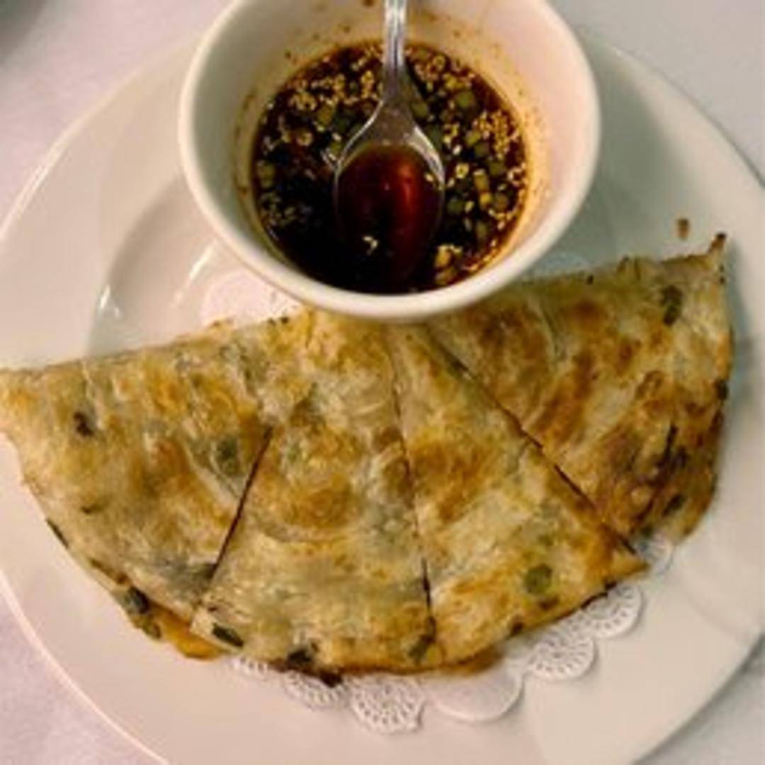 Savory pancake made with layers of flaky dough and chopped scallions, pan-fried until golden brown and crispy. Served with a dipping sauce.