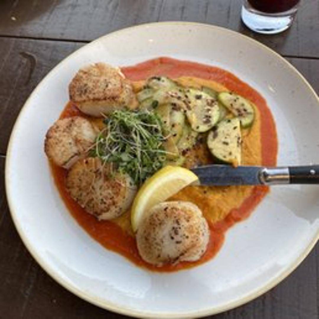 Delicate and sweet sea scallops, expertly seared to a beautiful golden-brown crust while remaining exquisitely tender and translucent in the center. These pristine morsels offer a refined taste and melt-in-your-mouth texture, showcasing their natural sweetness.