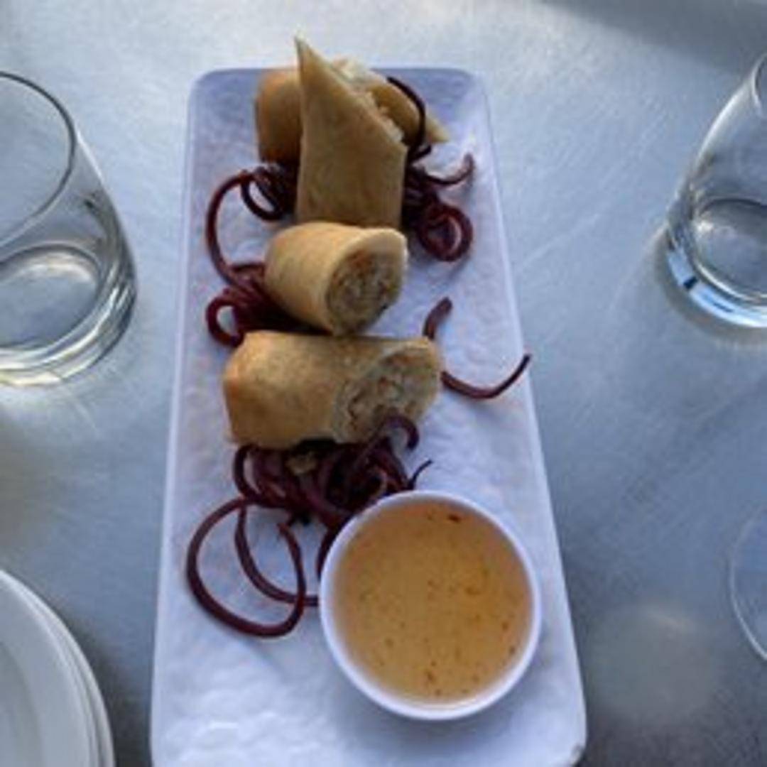 Crispy fried egg rolls filled with a mixture of vegetables and glass noodles, served with a sweet and sour sauce.