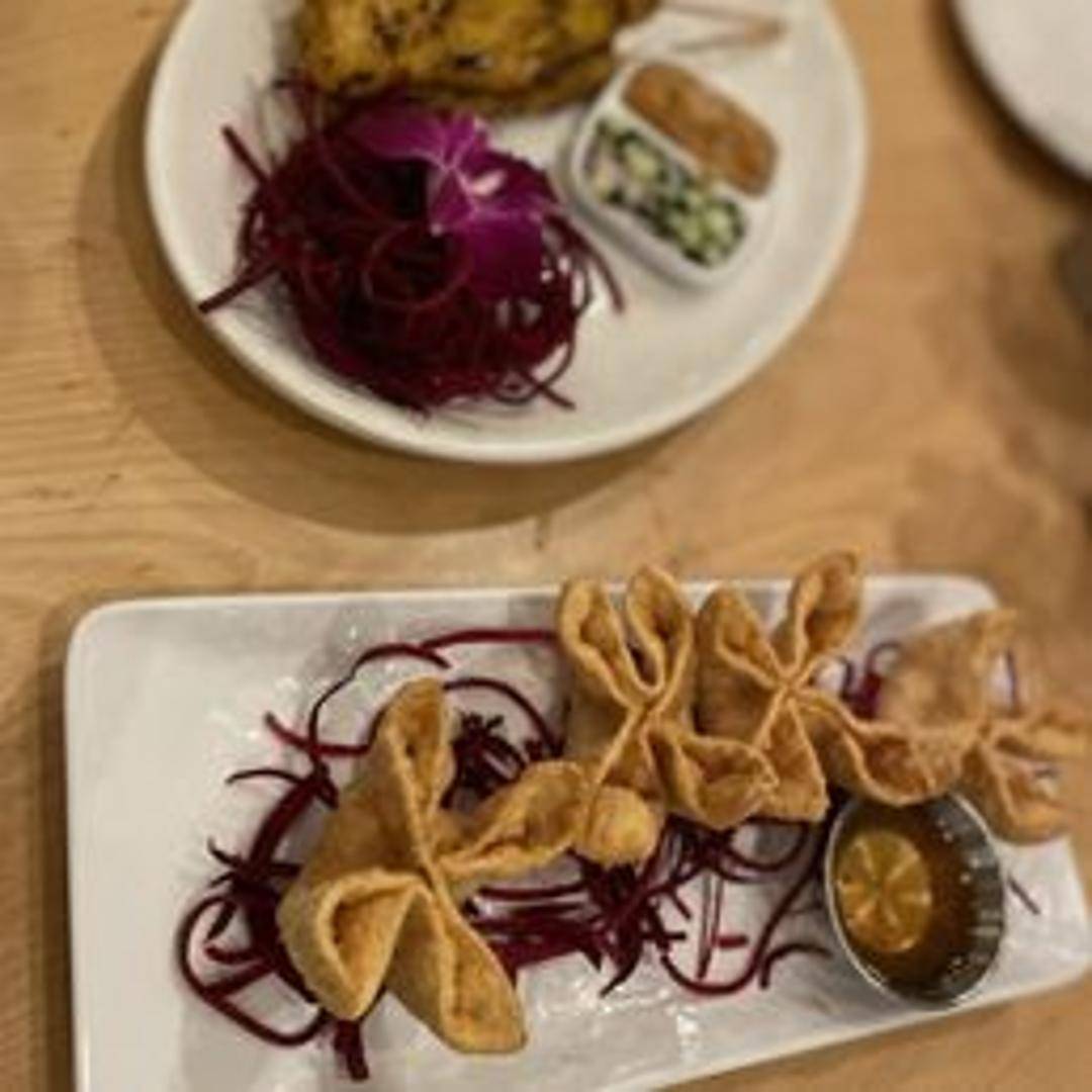 Crispy fried wontons filled with a creamy mixture of crab meat, cream cheese, and scallions, served with a sweet chili sauce.