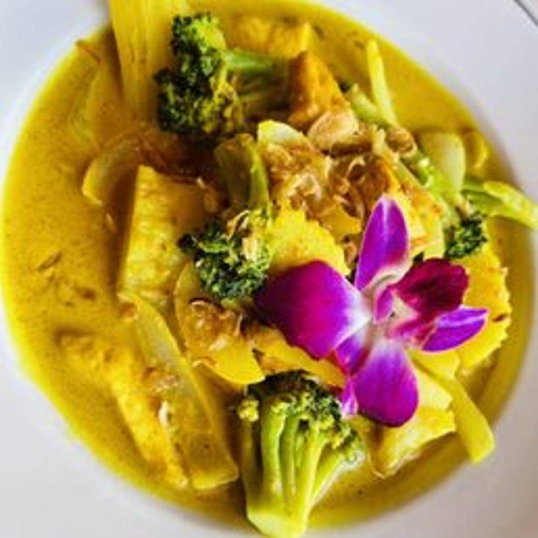A mild and creamy curry simmered in coconut milk with potatoes, carrots, and onions. Choice of protein.