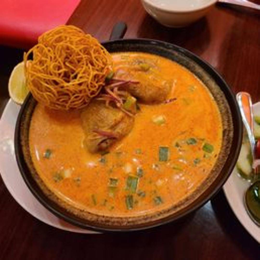 Northern Thai coconut curry noodle soup with crispy egg noodles, pickled mustard greens, shallots, cilantro, and your choice of protein. Served with a side of lime.