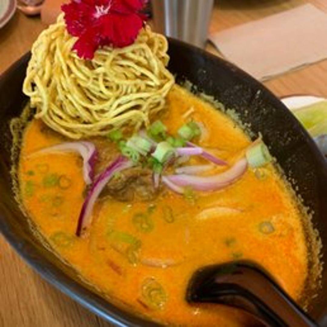 A Northern Thai specialty: creamy coconut curry noodle soup with egg noodles, topped with crispy noodles, pickled mustard greens, red onions, and your choice of protein.