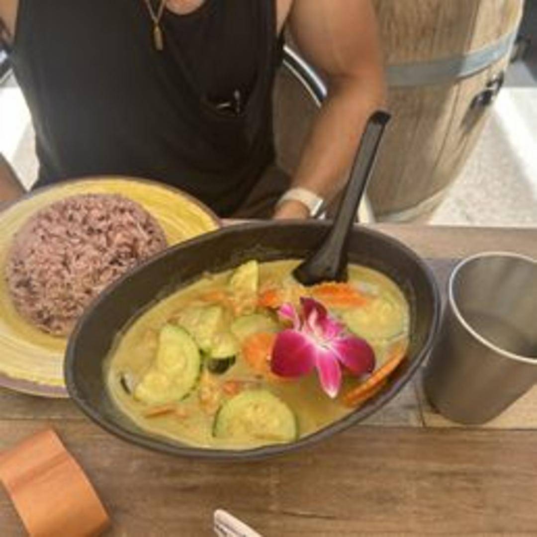 A rich and flavorful green curry cooked in coconut milk with bamboo shoots, bell peppers, zucchini, green beans, and fresh basil. Served with your choice of protein and steamed rice.