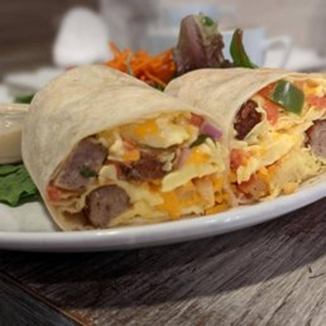 A warm flour tortilla filled with a hearty combination of scrambled eggs, cheese, and your choice of fillings. Common additions include potatoes, beans, and breakfast meats like bacon, sausage, or chorizo. Served with a side of salsa for added flavor.