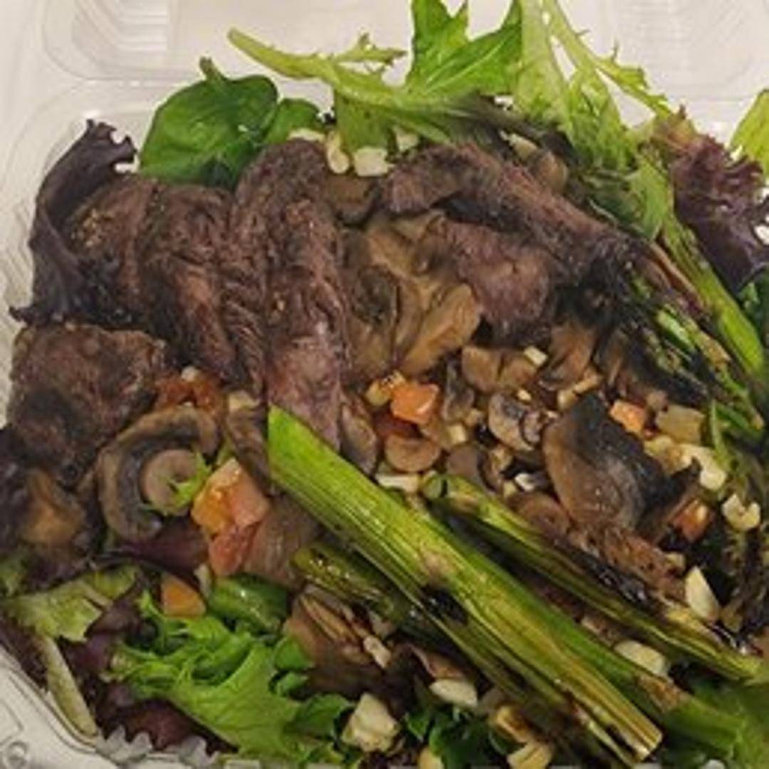 Grilled slices of tender steak served atop a bed of mixed greens, accompanied by cherry tomatoes, red onion, crumbled blue cheese, and a balsamic vinaigrette dressing.