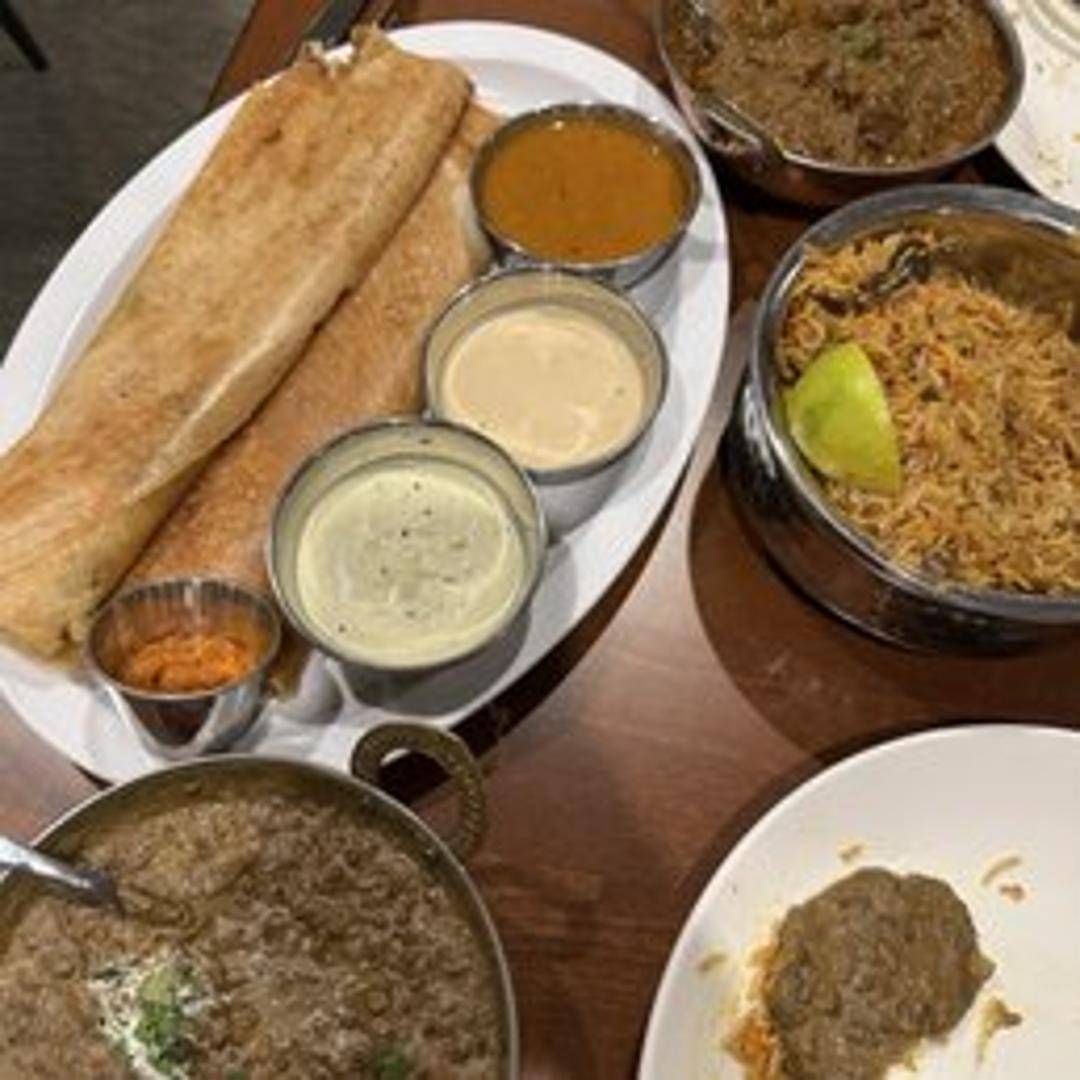 A crispy and thin South Indian crepe made from fermented rice and lentil batter, filled with a spiced potato mixture. Served with sambar (lentil-based vegetable stew) and coconut chutney.