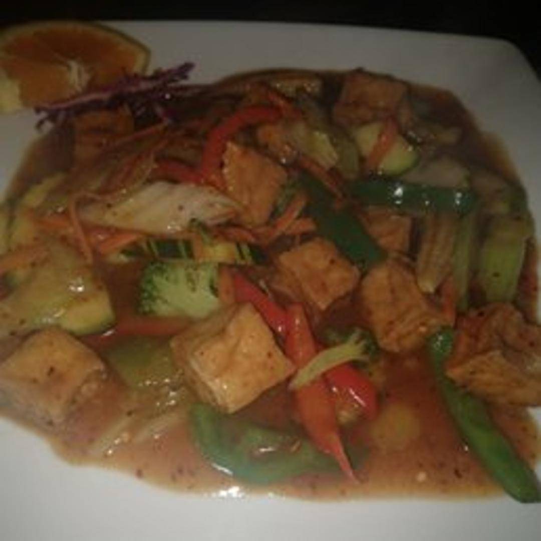 A vibrant and flavorful Thai stir-fry featuring your choice of protein (chicken, pork, beef, tofu, or shrimp) sautéed with a rich and slightly sweet chili paste (Prik Prow), bell peppers, onions, carrots, and cashews. Served with steamed jasmine rice.