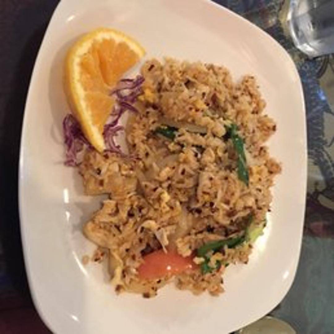 A flavorful combination of rice stir-fried with pineapple chunks, shrimp, chicken, cashews, raisins, peas, carrots, and a touch of curry powder. Served in a half-pineapple shell (when available) for a visually appealing and authentic Thai experience.