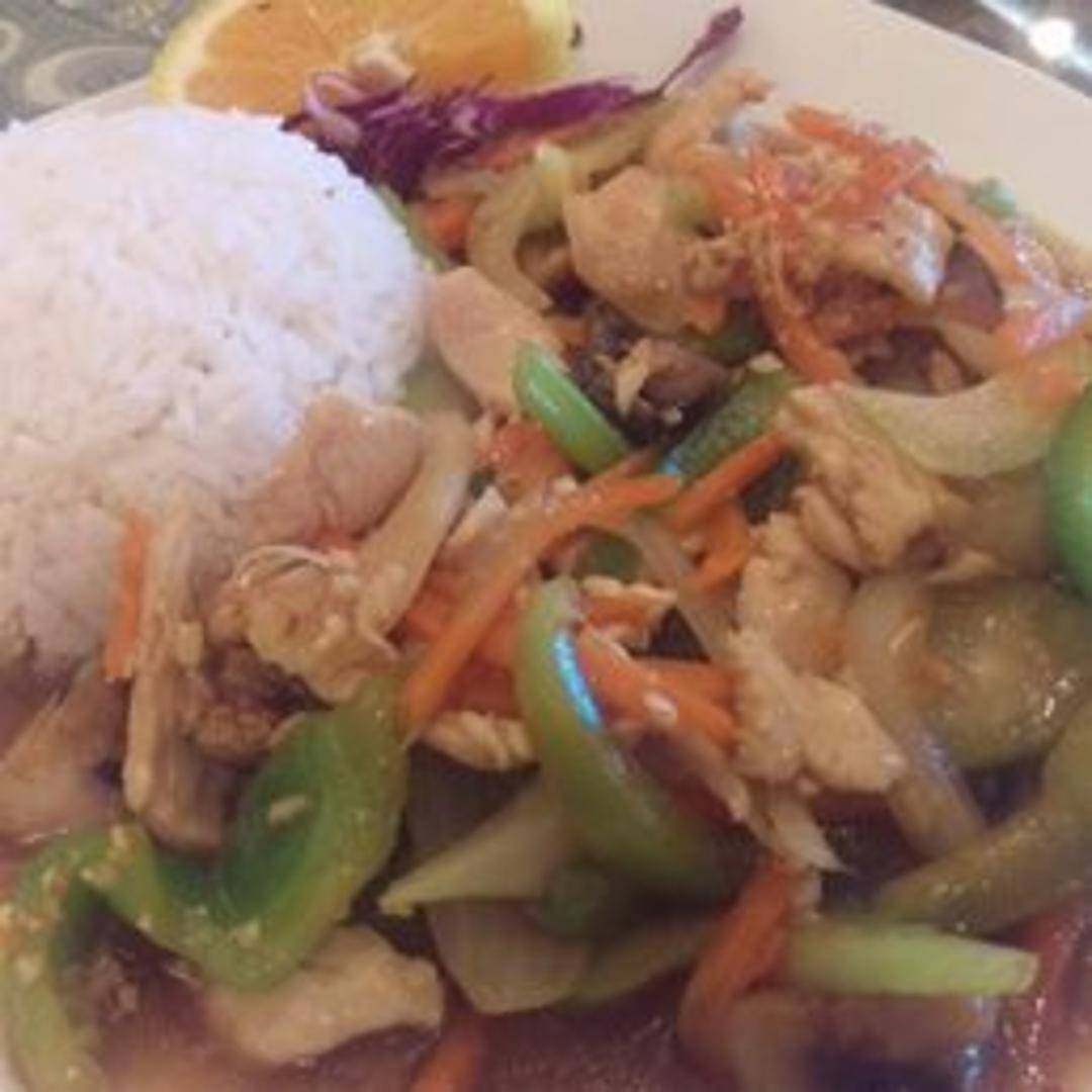 Tender pieces of chicken stir-fried with fresh garlic, black pepper, and a savory sauce. Served with steamed jasmine rice and garnished with cilantro.