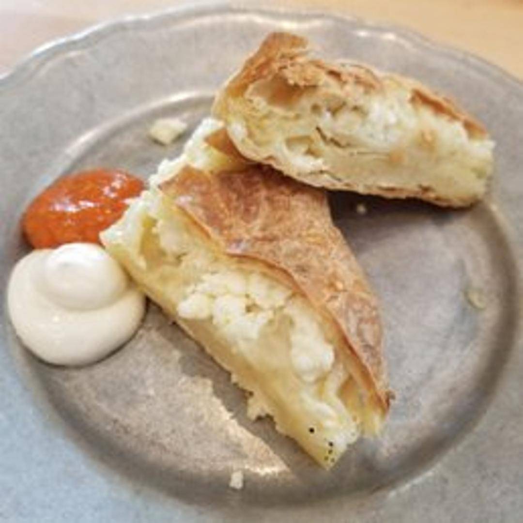 A savory traditional Balkan pastry, often known as 'Burek sa sirom', crafted with delicate, flaky phyllo dough, generously filled with a creamy, rich blend of authentic cheeses, baked until golden and delightfully crispy.