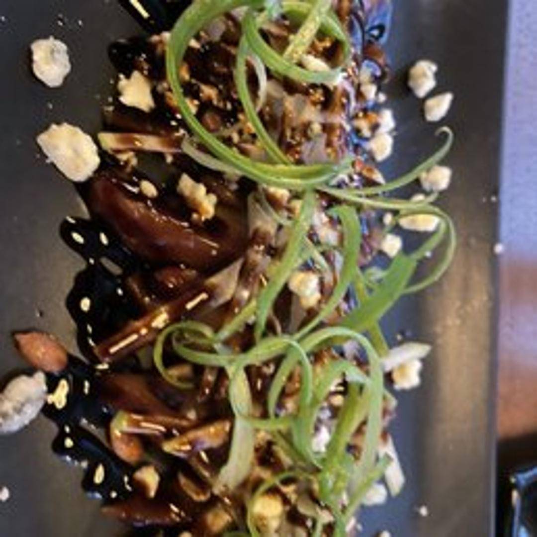 Thinly sliced poached pears arranged in a tiradito style, featuring a delicate citrus marinade and garnished with microgreens and toasted nuts.