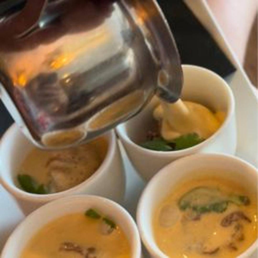 Delectable bite-sized servings of lobster meat in a savory broth, served in shot glasses for an elegant appetizer.