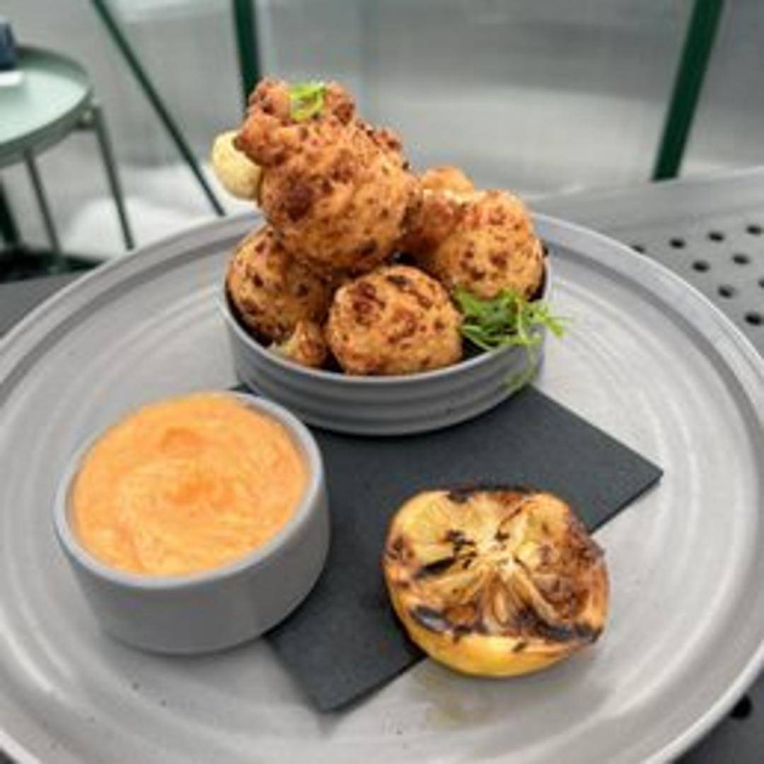 Battered and fried balls of creamy burrata cheese. The fritters are crispy on the outside and have a molten, cheesy center, often served with a dipping sauce or accompaniment.