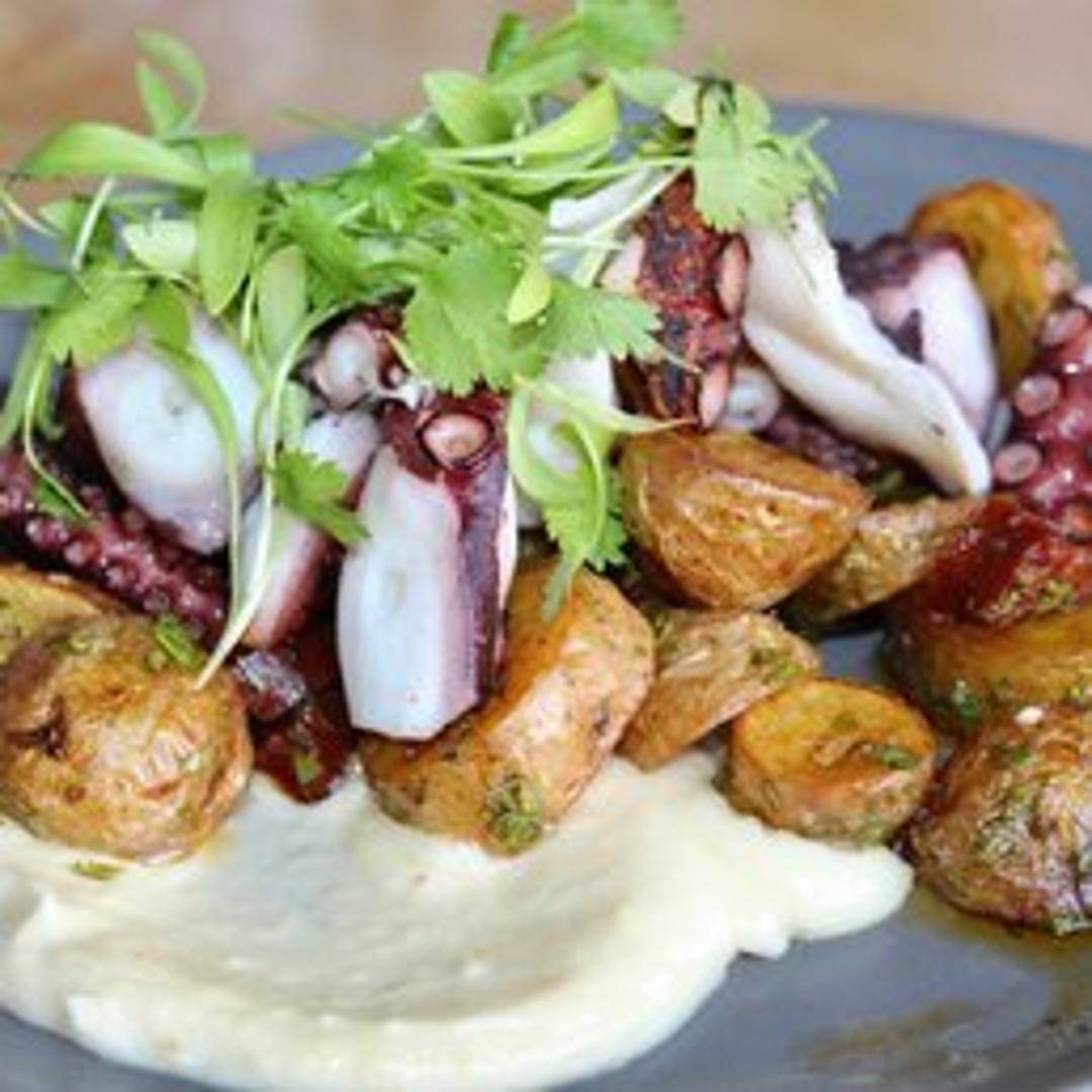 Tender grilled Spanish octopus, showcasing a slightly smoky flavor and a satisfyingly chewy texture. Prepared with Mediterranean-inspired seasonings and served with complementary vegetables or accompaniments.