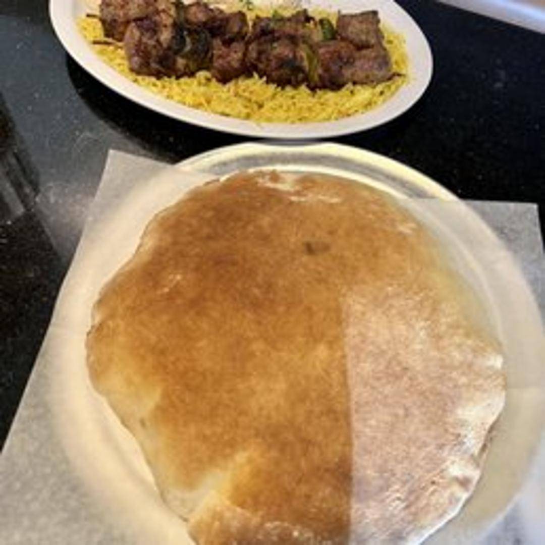 Grilled skewers of marinated lamb, seasoned with herbs and spices, served with rice or pita bread, and a side of vegetables.