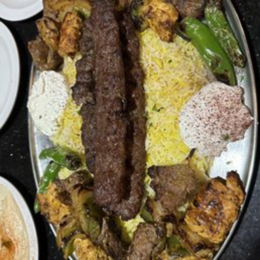 A combination plate featuring a selection of various grilled or roasted meats, served with rice or pita bread, and a side of salad or hummus.