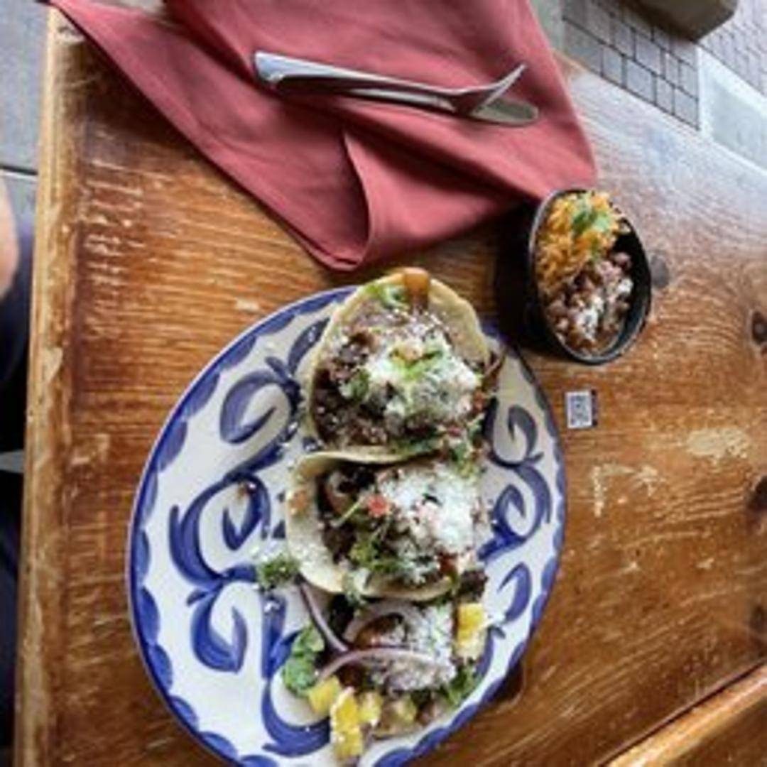 A selection of your choice of tacos, served with rice and beans.